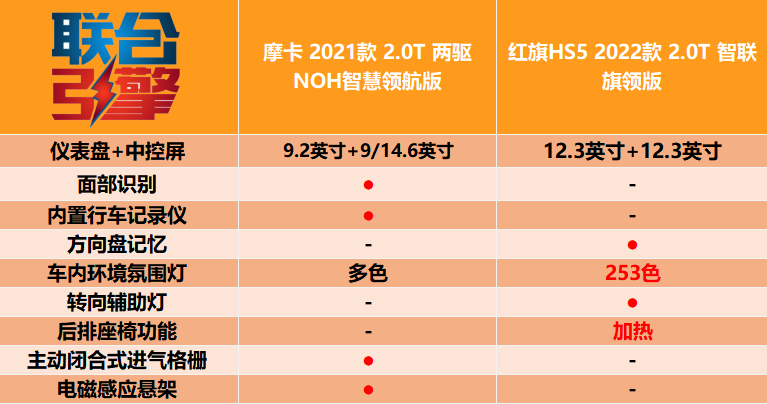 落实到配置部分,通过表格对比不难发现两车产品调性的差异。更加强调智能化的魏牌摩卡在原有不错L2级别驾驶辅助配置的基础上,加之NOH的使用,确实能让新车拥有了同级少有的高智能化水平。至于红旗HS5,第二排靠背调节、后排座椅加热,车内253色氛围灯的使用则更加注重驾乘者舒适性方面的体验。