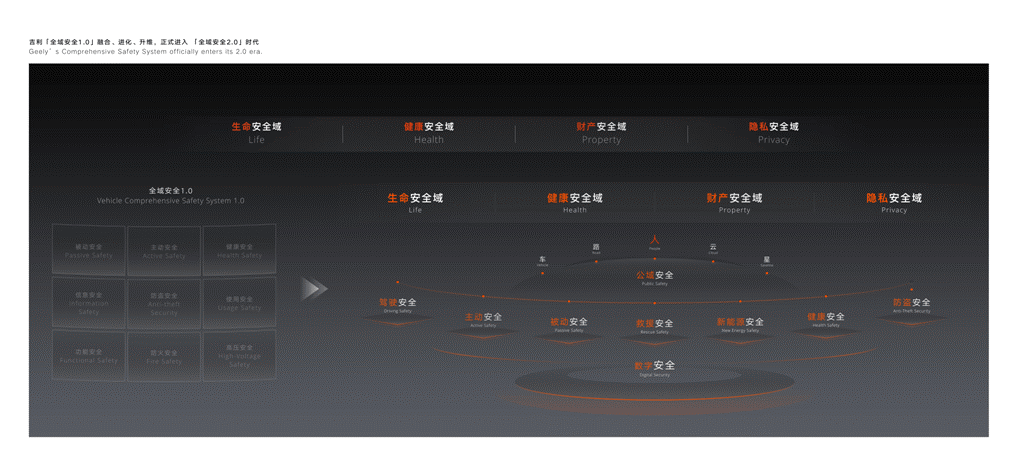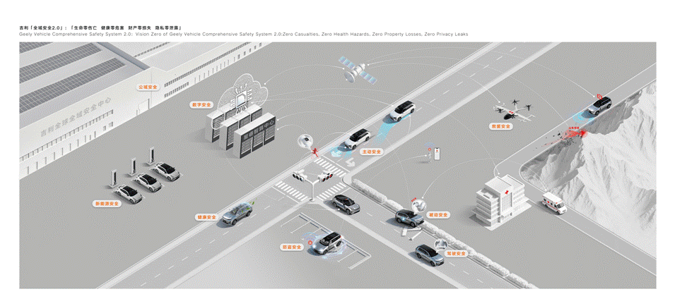 作为该中心的技术内核,吉利同步发布了全面融合“全域AI”的“全域安全2.0”技术体系。这一体系以“AI为纲 责任为本”,在原有全域安全框架之上,将安全视角从“整车”拓展至“人-车-路-云-星”的系统生态,以“生命零伤亡、健康零危害、财产零损失、隐私零泄露”为长期愿景,重构智能时代的安全逻辑。