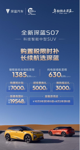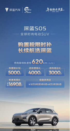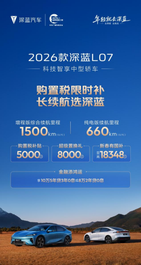 在产品层面,深蓝汽车集中推出深蓝S05、深蓝S07、深蓝L06、深蓝L07四款长续航车型,覆盖SUV与轿车两大核心细分市场,形成较为完整的产品矩阵,满足不同家庭结构、出行场景与使用习惯的多样化需求。配合车型布局,深蓝同步推出多项限时购车福利,包括购置税补贴至高10000元、换购福运礼至高10000元、新春国补至高20000元,并叠加“金融添鸿运”方案,至高可享5年0息政策。多重补贴叠加,有效降低用户购车门槛,为春节前后换车、添车提供现实可行的决策窗口。