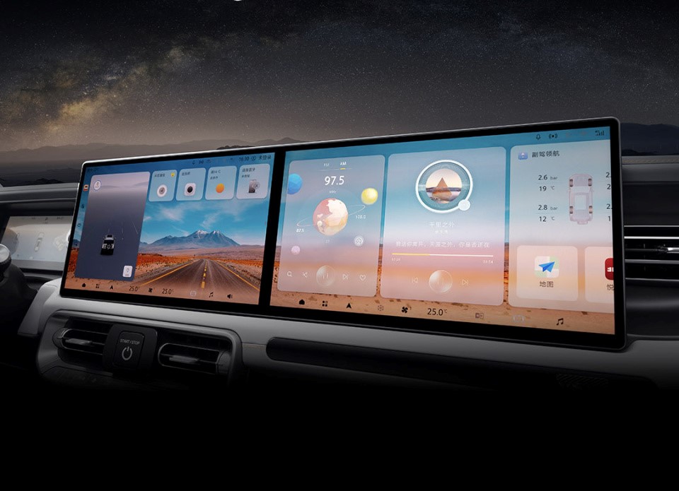 BJ40燃油巨幕版的内饰升级同样集中在智能座舱层面,新车配备10.25英寸全液晶仪表与15.6英寸中控副驾悬浮双联屏组合,屏幕衔接边框进一步收窄,整体观感更加通透,科技氛围明显增强。