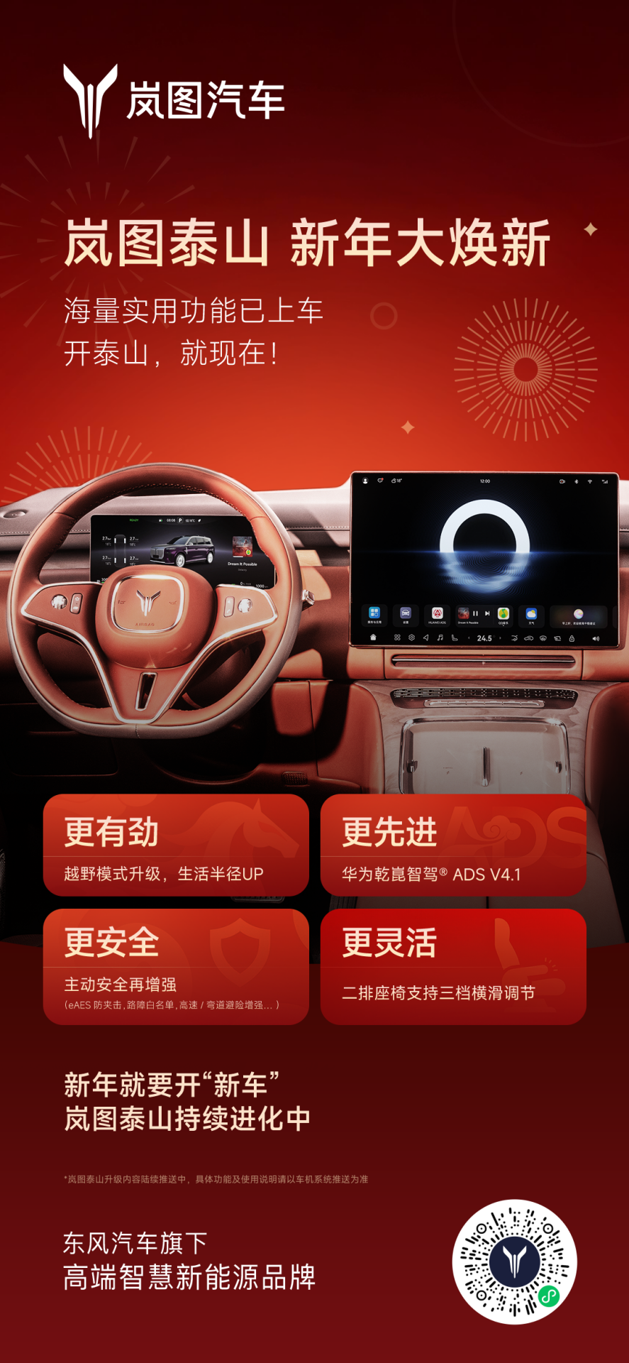 以乾崑之智,成泰山之稳。此次OTA不仅是岚图泰山产品力的一次全面进阶,更是岚图汽车坚持“以用户为中心”、持续推动技术创新与体验升级的集中体现。通过华为乾崑智驾ADS 4.1的深度融合、独有越野能力的持续强化,以及贴合商务需求的座舱优化,岚图泰山正在重新定义高端商务SUV的全能边界。