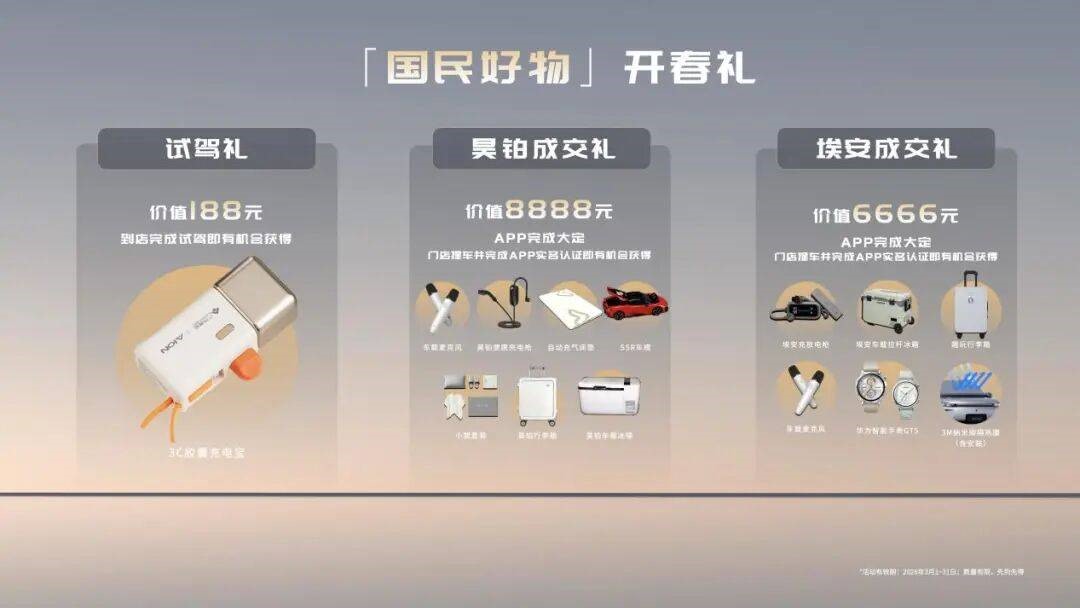 为了让更多用户体验这一生态体系,埃安还同步推出专属权益活动。3月份期间,在昊铂或埃安销售门店完成试乘试驾,即有机会获得价值188元的国民好物试驾礼;完成下定的用户,则有机会获得价值8888元或6666元的国民好物成交大礼包。这些权益不仅提升了用户体验,也成为品牌生态落地的重要组成部分。