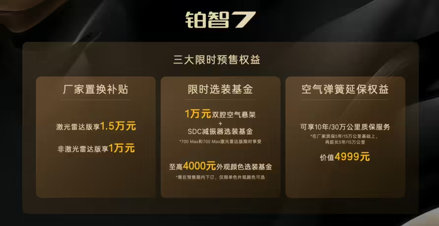 与此同时,新车还带来了三项限时预售权益:厂家置换补贴:激光雷达版本可享1.5万元置换补贴,非激光雷达版本可享1万元补贴;限时选装基金:最高可达1.4万元,其中包括1万元双腔空悬+SDC减振器选装基金以及最高4000元外观颜色选装基金;空气弹簧延保权益:价值4999元,将双腔空气悬架质保周期延长至10年或30万公里。这些权益降低了用户体验高阶配置的门槛,同时也体现了广汽丰田在产品推广阶段所释放出的诚意。