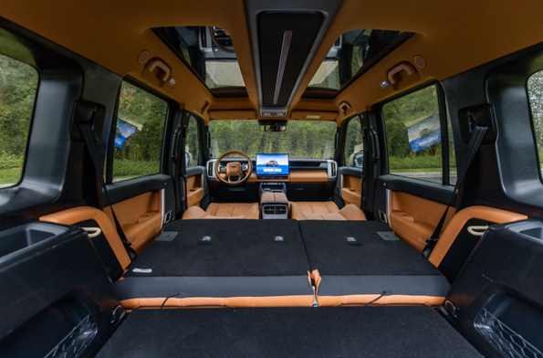 空间表现同样是iCAR V27的重要卖点。车内最大挑空高度达到1350mm,配合方正的车厢结构,带来较为宽敞的乘坐空间。当后排座椅完全放倒后,后备厢空间可扩展至1818L,并可形成约2150×1050mm的平整区域。配合定制床垫使用时,车辆可以在长途旅行或户外露营场景中承担更多功能。与此同时,车内还设置了50处储物空间,以满足家庭用户日常使用中的多样化需求。